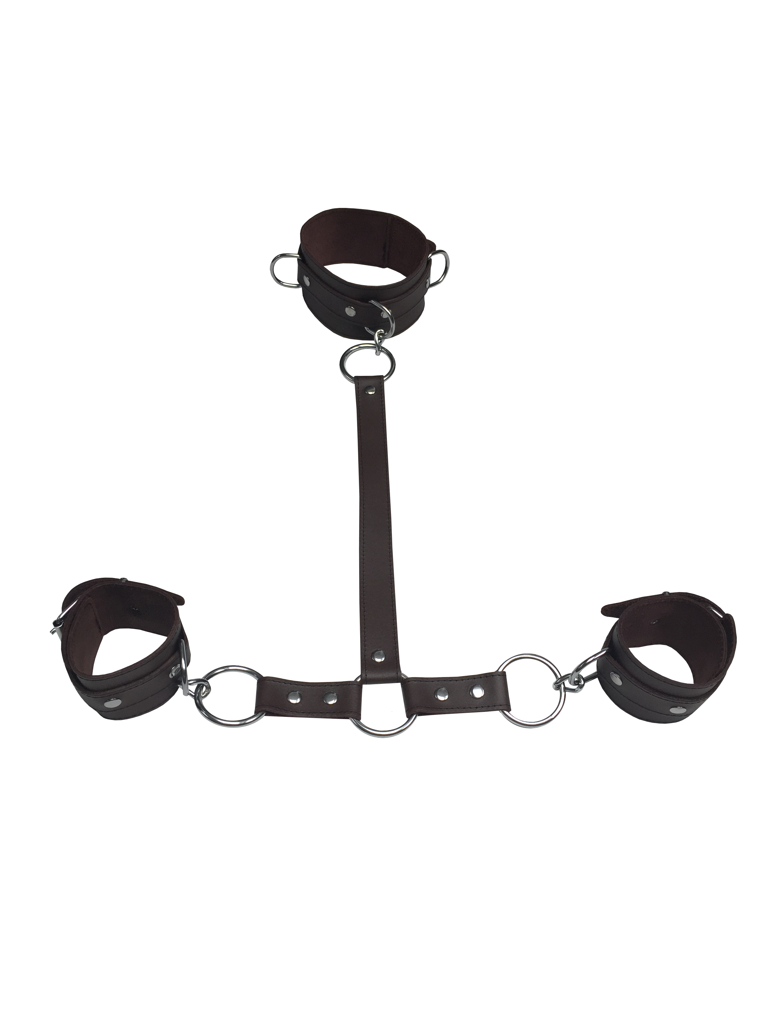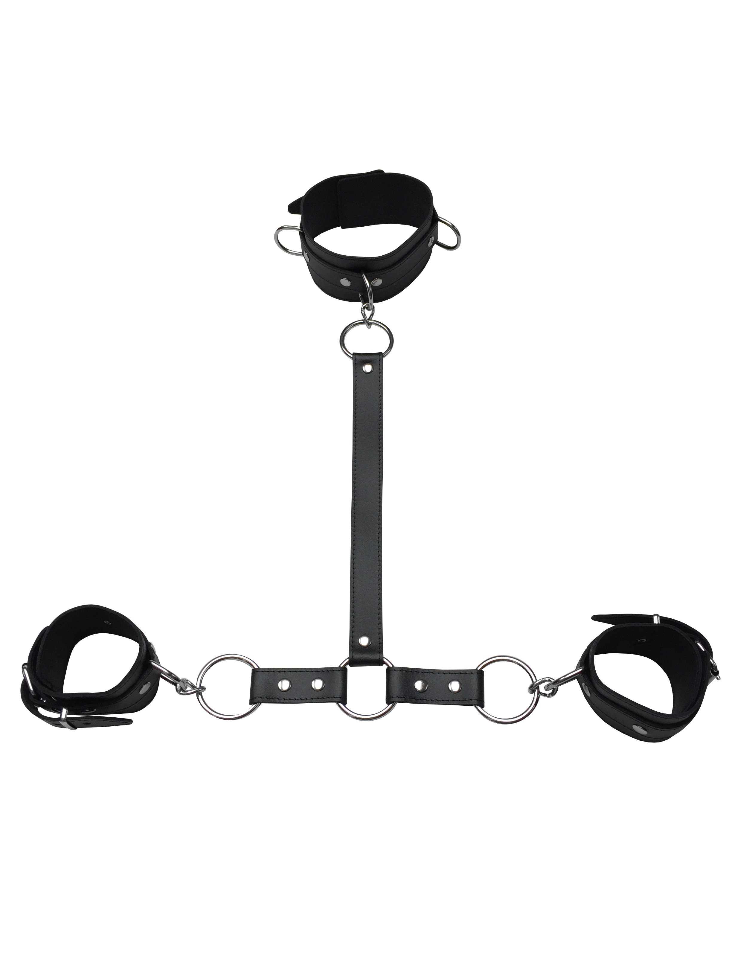 Halsband, Lederverbindung und Handfesseln aus robustem Leder.