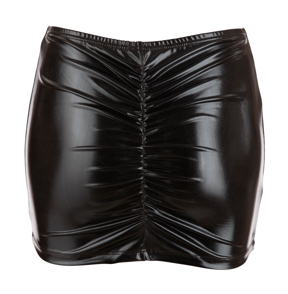 Dieser heiße Minirock aus schwarzem Wetlook bringt den Po dank der rückseitigen Raffung perfekt zur Geltung.
